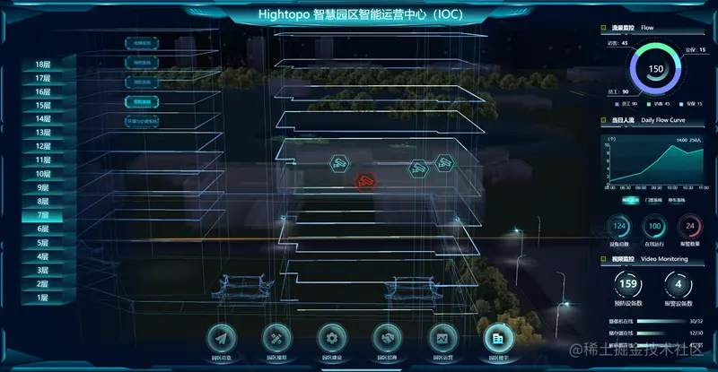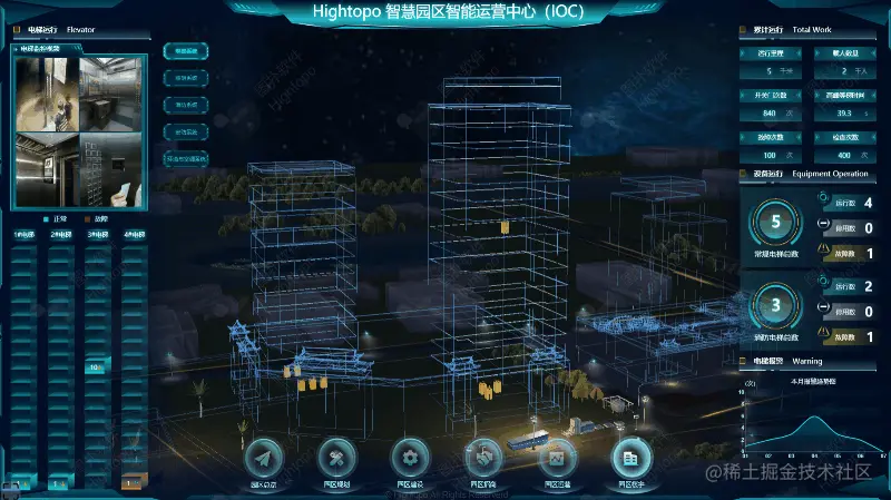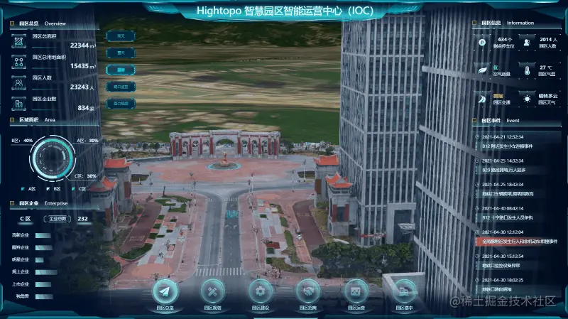 通过图扑软件的可视化引擎以及地理信息系统(Geographic Information System,GIS) 相关技术,对智慧园区运营中心(Intelligent Operations Center,IOC) 进行全方位的数字化建设,一屏展示园区全貌以及园区内建筑、招商、运营、楼宇等相关信息,实现园区的统一管理、监控、预警、调度等一体化建设。
