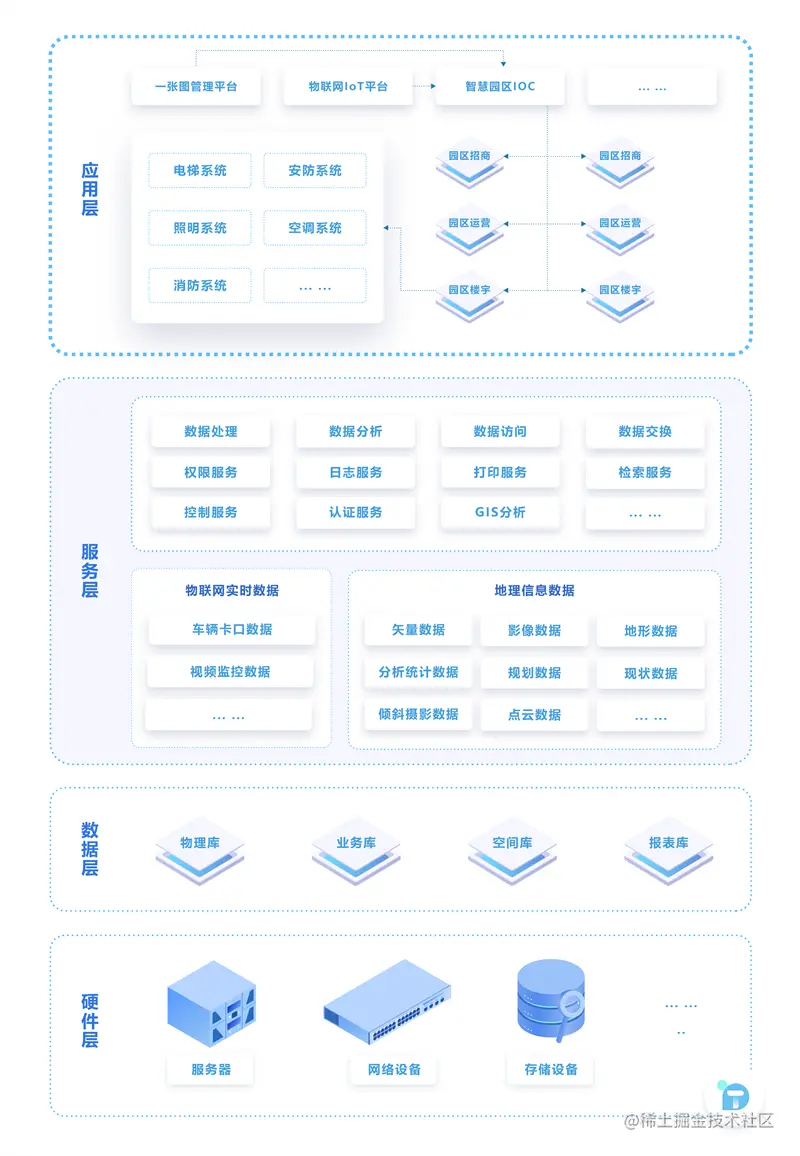 智慧园区的总体框架主要分为硬件层、数据层、服务层和应用层。