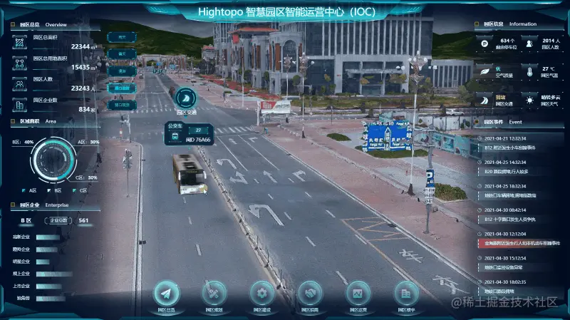 园区运营是智慧园区后期的一个重要管理,目标在于提高园区的维护管理、监控管理以及运营效益。通过将可视化和物联网技术结合实现园区人、车、物、环境等信息智能化监控和管理。整合物联网智能设备数据,形成智能设备态势分析。HT 智慧园区可视化为园区和企业管理提供了数字化运维方式,提升日常办公和跨部门协作的能力,使园区运营工作实现全面信息化和移动化。