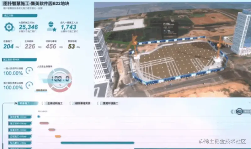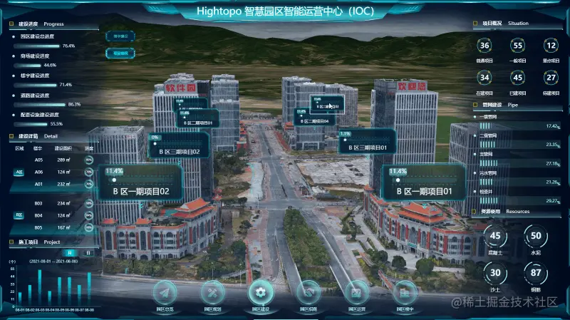 园区的建设进度关系着各产业进驻的情况,通过面板数据可了解到园区建设总进度、商场建设进度、楼宇建设进度、道路建设进度、配套设施建设进度。也针对园区内的不同建设区域展示了项目名称、分布以及进度等详情。对于园区内的建设使用资源使用也进行了展示,直观透明。