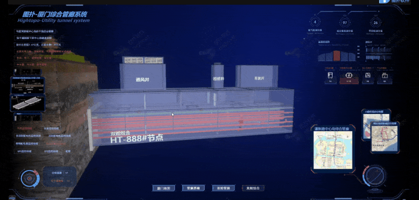 为完善城市功能、提升城市综合承载力,我国大力推行地下综合管廊建设,地下综合管廊系统不仅解决城市交通拥堵问题,还极大方便了水、电、气、热、通信等市政设施的维护和检修。图扑软件(Hightopo)采用轻量化建模技术仿真地下综合管廊,通过三维可视化展现,大幅提高综合性管廊的运维服务质量,加快构建智能控制、智慧运维于一体的绿色管廊三维可视化管理系统。