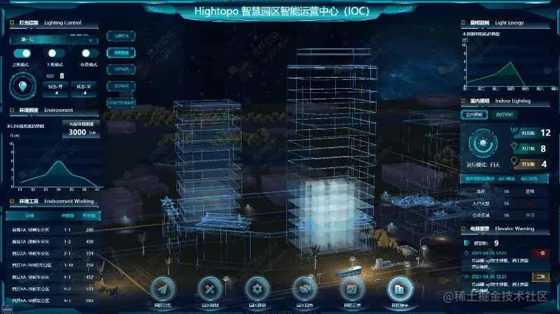 集成楼宇内外的照明系统,用 HT 智慧园区可视化平台对楼宇内的照明设备进行集中监控,可调整不同时段的灯光效果模式,对环境照度以及照明能耗通过数据趋势图进行分析展示,对室内外照明检测运行状态进行实时更新,让管理人员能够及时处理照明系统问题。通过系统接入可视化,让问题及时发现及时处理,帮助运维人员及时处理照明设备的维修问题,提高楼宇的管理效率和服务水平。