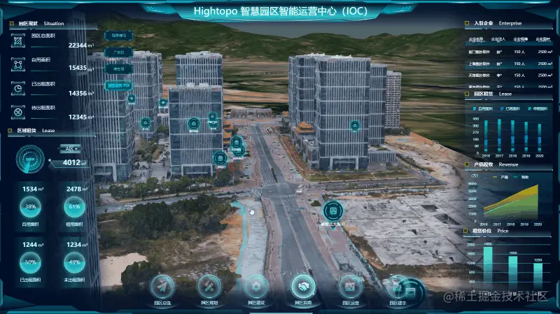 通过 HT 可视化系统搭建智慧园区的全场景实现,两侧二维面板辅以数据可视化,对园区各类基础建设数据以更加多样化形式展现,为园区规划、布局、分析和决策提供技术支撑,推进园区数字化转型建设。