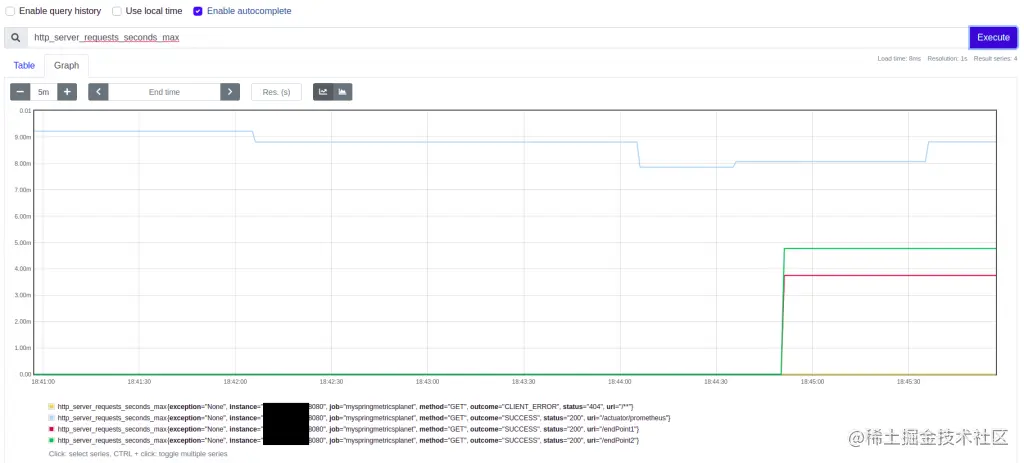 现在可以显示Prometheus指标。通过访问http://localhost:9090/graph,在搜索框中输入http_server_requests_seconds_max并单击“执行”按钮,将为你提供请求期间的最长执行时间。