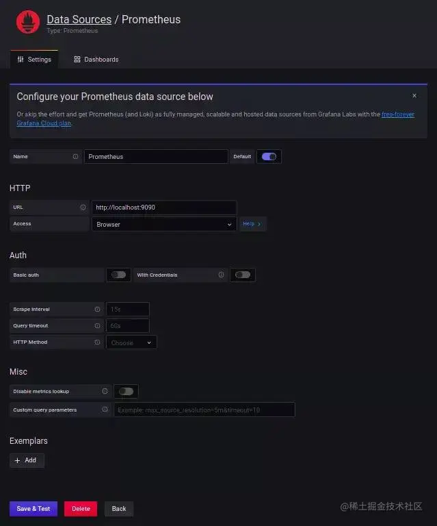 填写可访问Prometheus的URL,将HTTP Access设置为Browser,然后单击页面底部的Save&Test按钮。