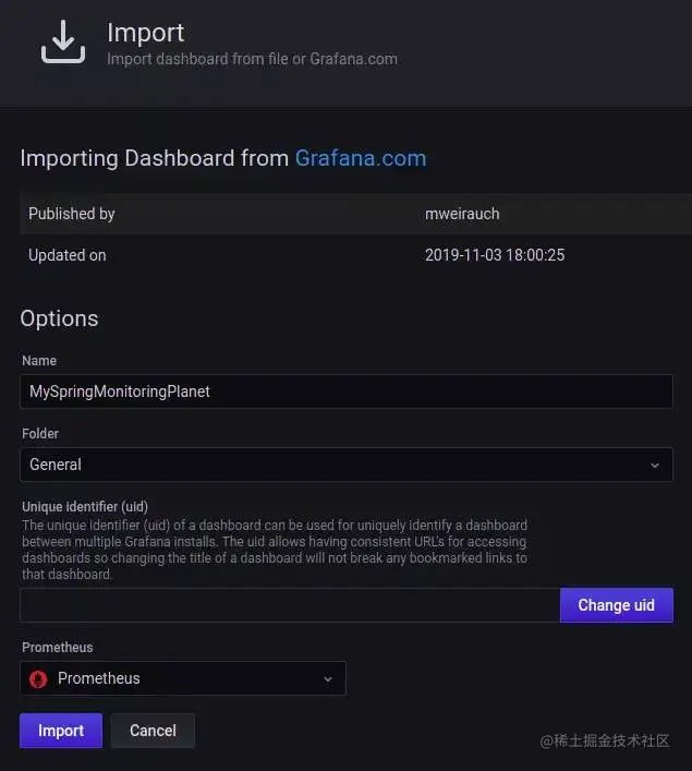 为仪表板输入一个有意义的名称(例如MySpringMonitoringPlanet),选择Prometheus作为数据源,然后单击Import按钮。