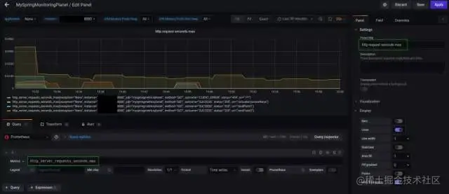 在Metrics 字段中,输入http_server_requests_seconds_max,在右侧栏中的Panel title字段中,可以输入面板的名称。