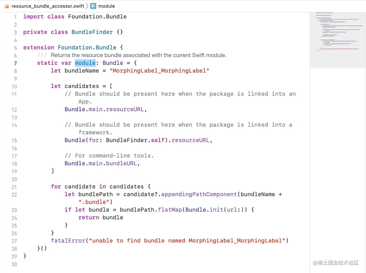 Swift Package 需要对每一个文件指明用途。代码文件会自动识别并编译打包,资源文件需要指定和说明。Swift Package 会为每一个 Package 生成一个 module 扩展,以便直接调用。使用命令行将项目文件 Package.swift 转换成 xcproj 则不会生成该模版定义文件。以下定义会在 Bundle 类内生成 .module 属性专门用于获取 Particles 文件夹内的资源。
