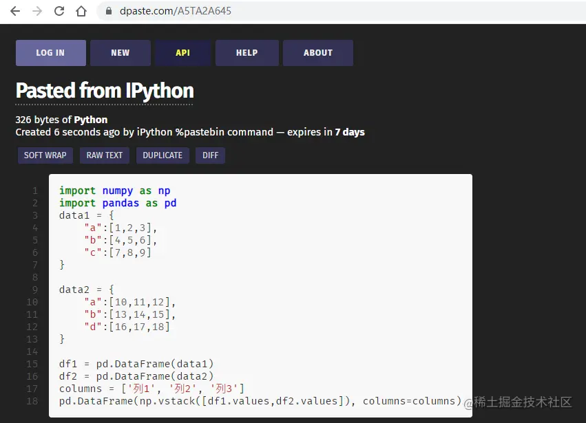 该魔法命令可以将代码上传到Pastebin并返回一个链接。其中Pastebin是一个线上内容托管服务,我们可以在上面存储纯文本,如源代码片段,所形成的链接也可以分享给他人。