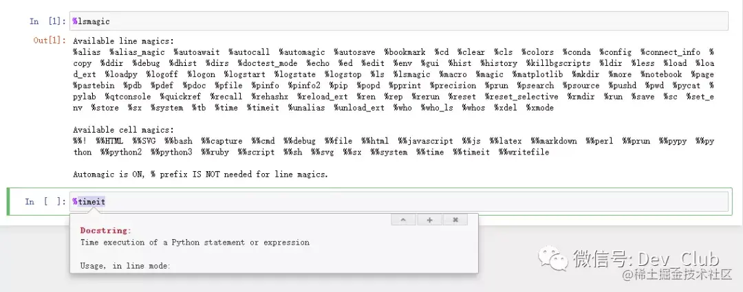 magic函数主要包含两大类,一类是行魔法(Line magic)前缀为%,一类是单元魔法(Cell magic)前缀为%%;