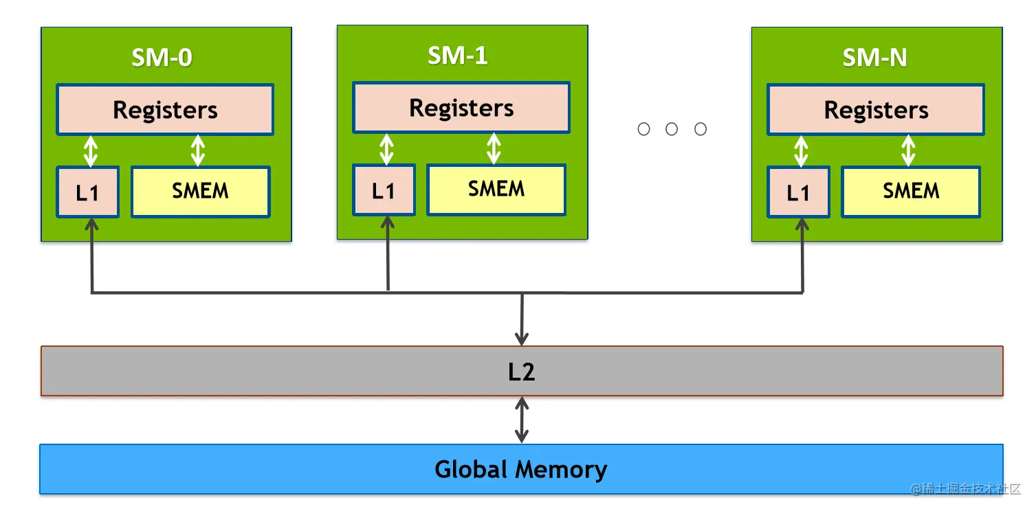 分析代码我们可以看到,计算一次 FMA(乘累加)之前需要读一次 A 和读一次 B,众所周知,读取 Global Memory 的代价很大,通常都需要几百个 cycle(时钟周期),而计算一次 FMA 通常只需要几个 cycle,大量的时间被花费在了访存上。也许有思维活络的同学立马想到,可以将 A 和 B 矩阵先搬运到 Shared Memory(SM 中低延迟的 on-chip memory,block 内线程共享,附 NVIDIA GPU 内存结构图)中降低访存的开销,这的确是一个很好的思路,但是这只能将访存代价从几百 cycle 降低到几十 cycle,并不改变问题的本质。问题的关键在于主体循环由两条 Load 指令与一条 FMA 指令构成,计算指令只占总体的 1/3,计算访存比过低,最终导致了访存延迟不能被隐藏,从而性能不理想。