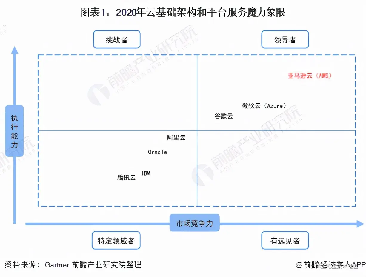 在由Gartner2020年发布的云基础架构和平台服务魔力象限中,AWS长期处于细分市场的领导者象限。Gartner在评估报告中认为,AWS的云计算服务产品在计算、存储、网络、IaaS等多个基础领域均占据了绝对优势。