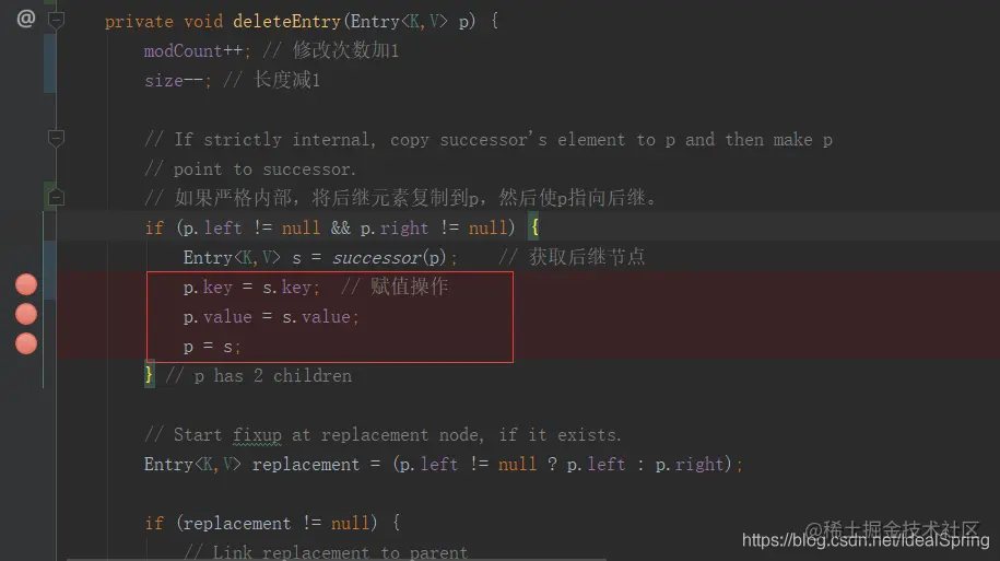 在看TreeMap类是如何删除红黑树时,从remove方法看起,当看到deleteEntry(Entry<K,V> p)方法时: