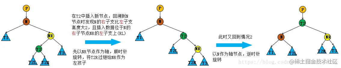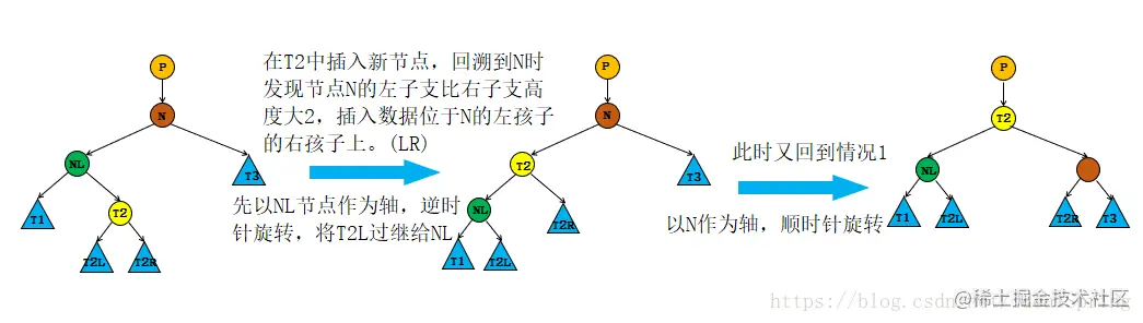节点N左子支比右子支高度大2,且插入的节点位于节点N左孩子节点NL的右子支上