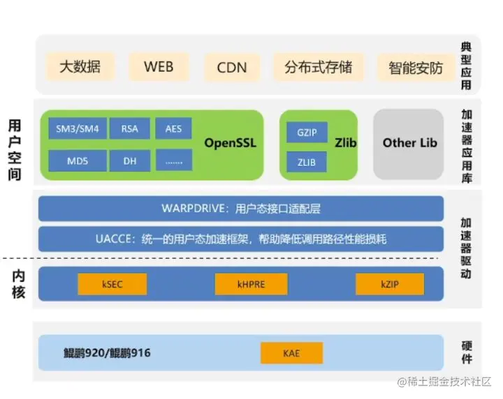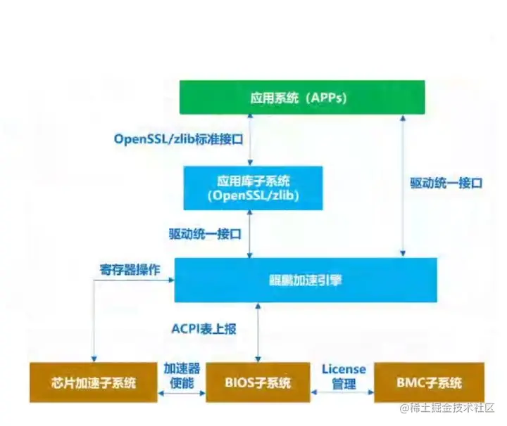 3. 上层应用基 于OpenSSL/zlib加速库调用鲲鹏加速引擎, 并通过寄存器操作调用芯片加速子系统。