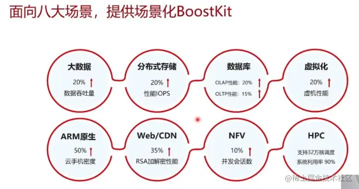 鲲鹏应用使能套件 BoostKit,释放倍级性能优势,提供八大场景化应用使能套件:大数据、分布式存储、数据库、虚拟化、ARM原生、Web/CDN、NFV和HPC。