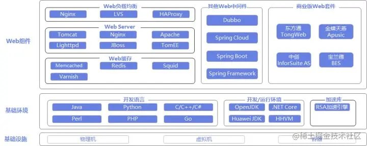 鲲鹏BoostKit Web遵循开放式架构标准,支持所有开源的Web组件,并根据具体Web组件特点,提供了良好的场景适用性。鲲鹏BoostKit Web软件堆栈如下图所示: