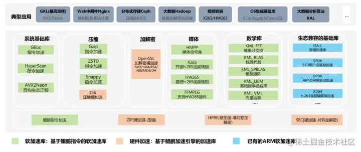 华为鲲鹏计算加速库是华为公司围绕鲲鹏处理器进行性能优化后的软件集合的统称,鲲鹏BoostKit加速库提供基于ARM指令深度优化和基于鲲鹏KAE(鲲鹏硬件加速引擎)开发的加速库,覆盖系统库、压缩、加解密、媒体、数学库、存储、网络等7类加速库,为大数据加解密、分布式存储压缩、视频转码等应用场景提供高性能加速。
