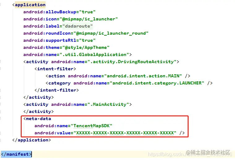 将上面申请的key在application标签下进行如下配置(value替换成自己的key)