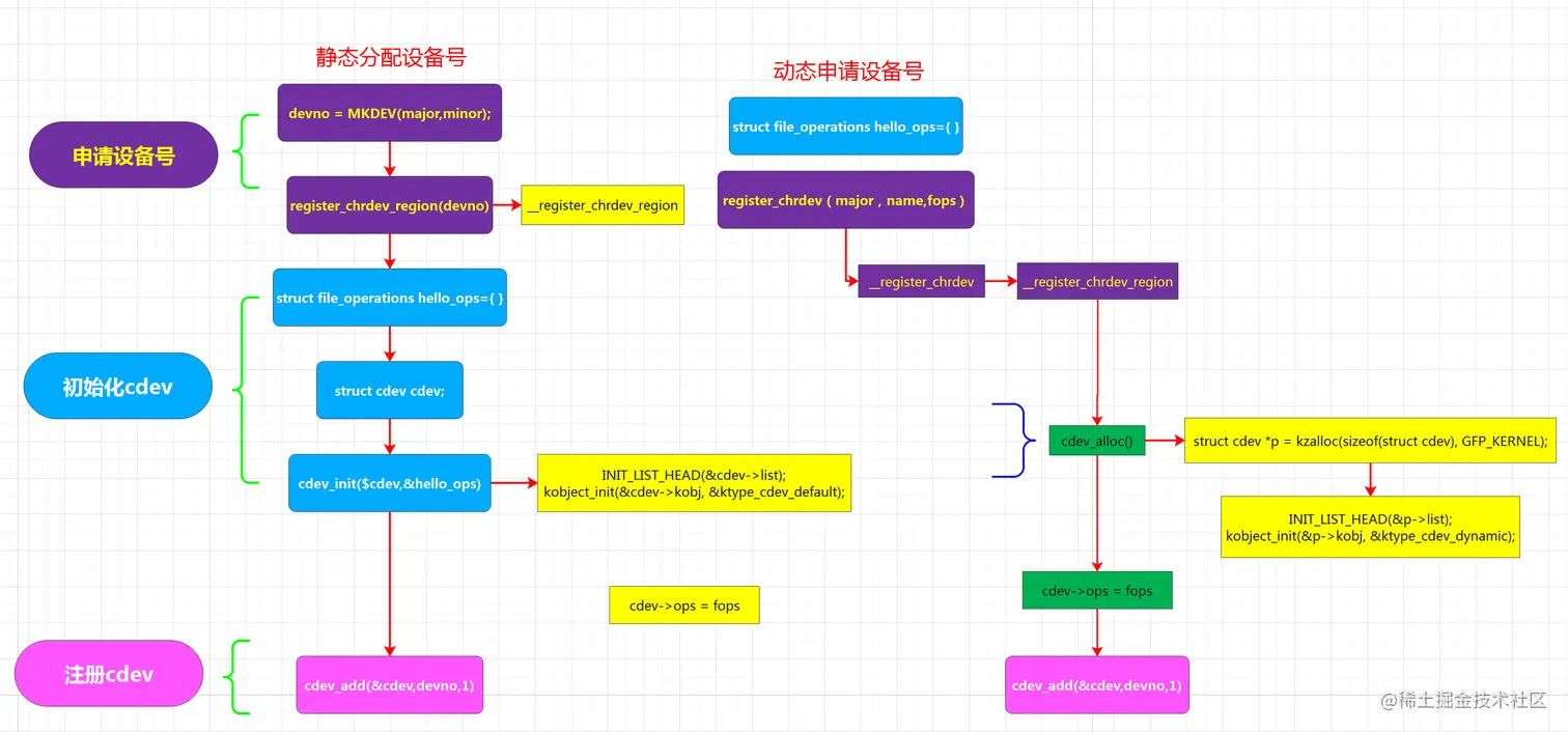 了解了架构之后,那么我们来看一下内核中完整的创建字符设备的流程及对应的函数调用关系: