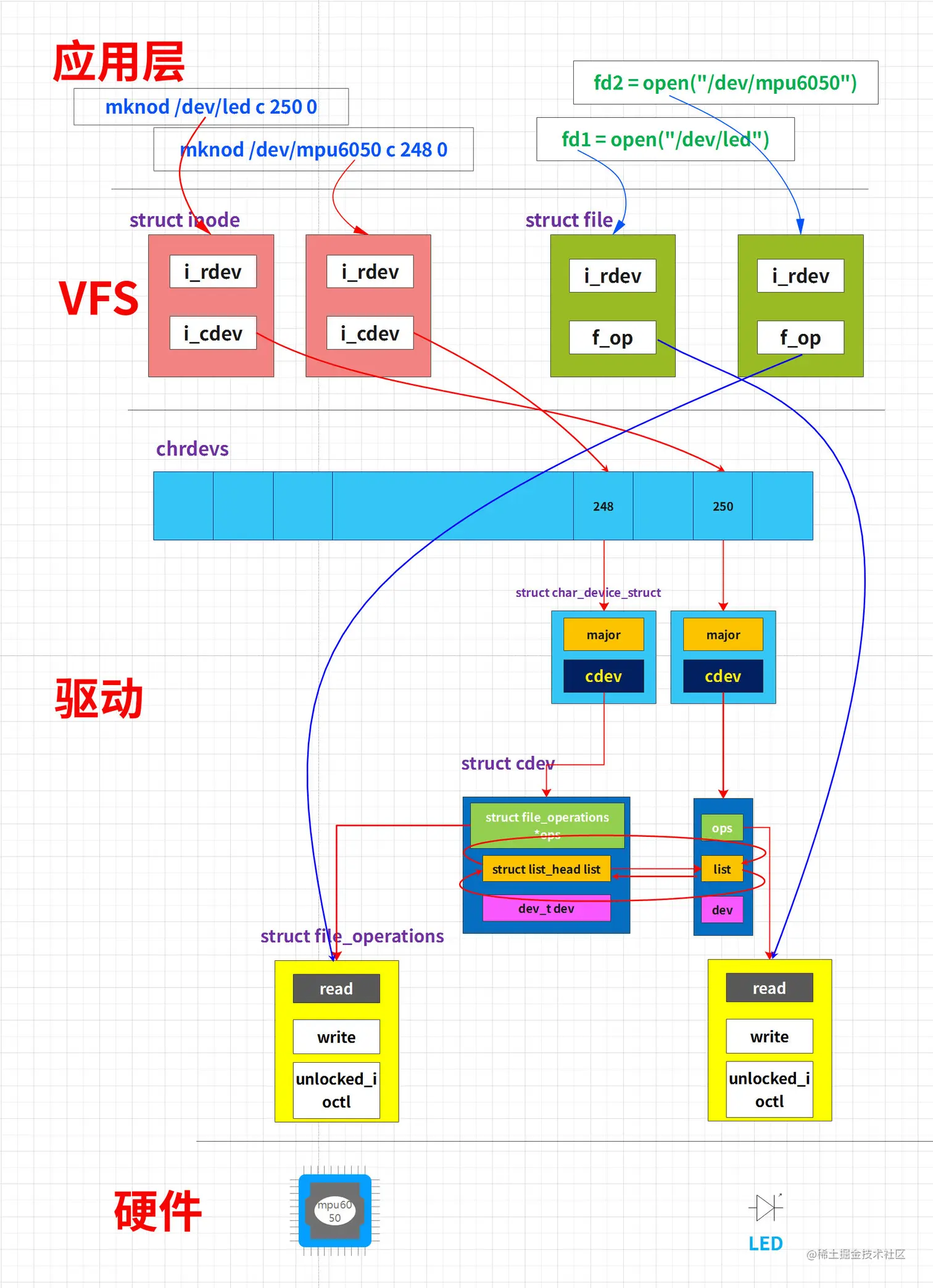 下面我们以两个设备:LED、MPU6050为例来讲解字符设备的架构