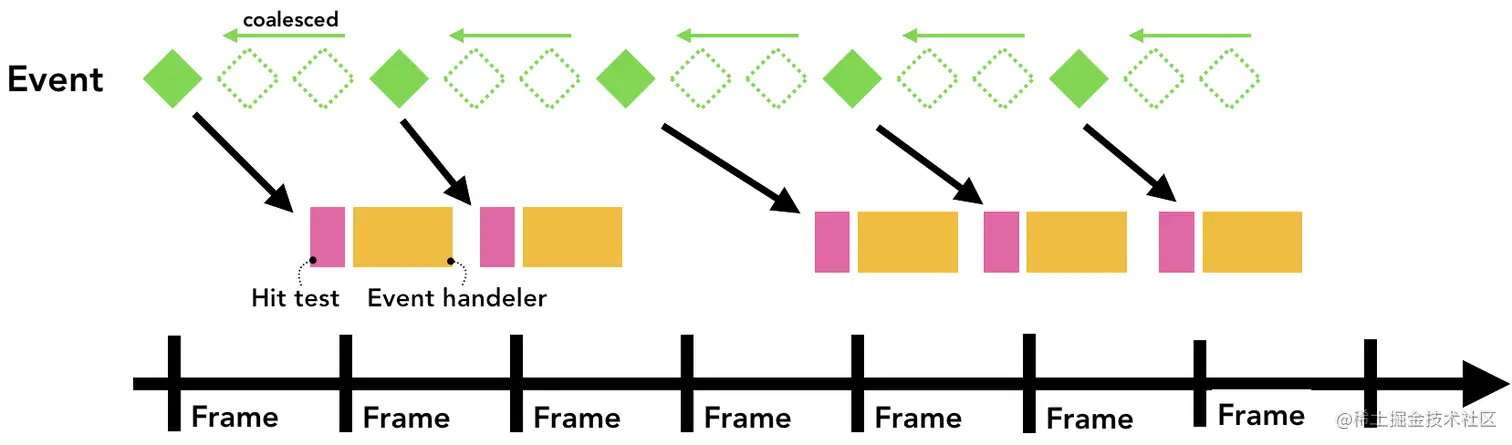为了尽量减少对主线的过多调用,Chrome 会合并连续事件(例如 wheel, mousewheel, mousemove, pointermove, touchmove)并将调度延迟到下一个 requestAnimationFrame 之前。