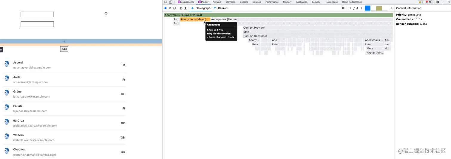 现在我们知道如何阅读 Profiler 的展示面板以及生成的图表信息,为了更直观的感受到阻止 reRender 的效果,我们在例子中增加一个常见的 List 再来看一下。