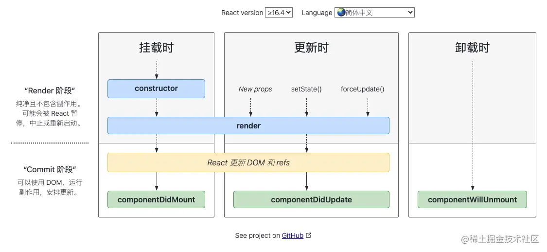 从概念上讲,React 分为两个阶段工作,React 的生命周期图谱如下所示: