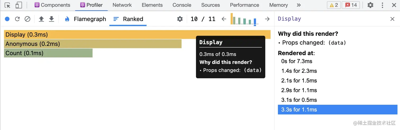 如果你非常了解这里的代码,可以非常容易想到下一步就是优化 Display 的代码,因为这里的 props.data 看起来并没有发生什么变化。当然也可以在这个时候切换到 Components 选项卡,来确认你的想法,这里有组件更为详细的信息。