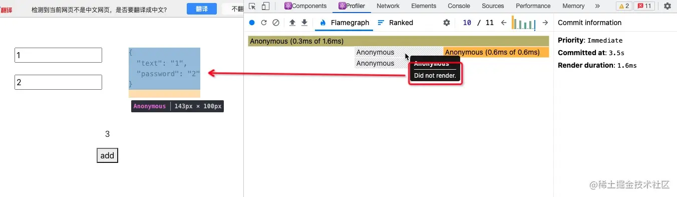 很遗憾,虽然 Display 在 React.memo 的比较函数之下,已经不再重新 render。但是 Display 的渲染时间和应用的渲染时间相比改写之前都变大了,这说明 memo 函数的比较时间大于组件自身的渲染时间,在当前这个简单的应用程序下,以 React.memo 来 "优化" 应用是得不偿失的。