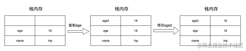 复制的时候,在栈内存中重新开辟内存,存放变量 age2,所以在栈内存中分别存放着变量 age、age2 各自的值,修改时互不影响。