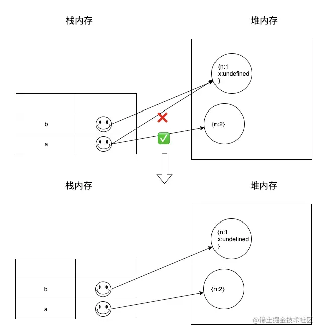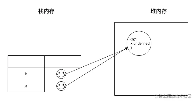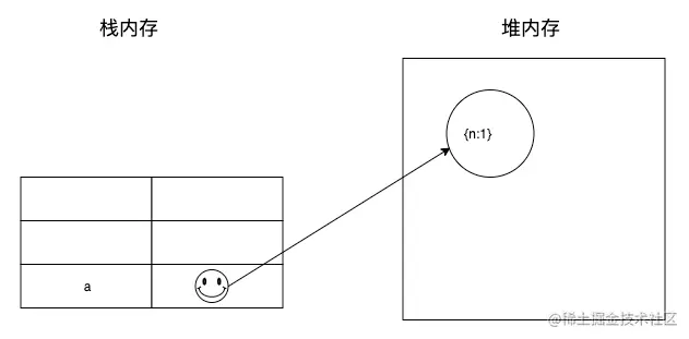 首先var a = {n:1}; 时,为变量 a 在堆内存中开辟了一块内存空间。