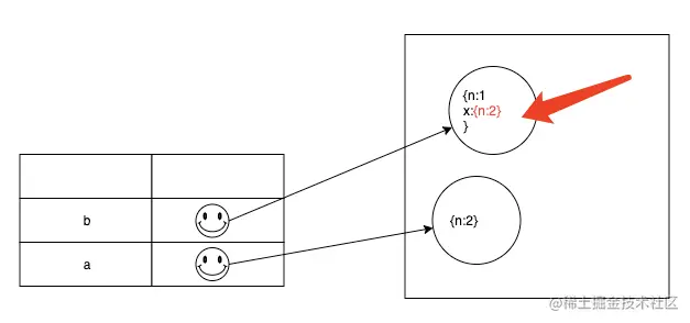 到这里函数执行完毕,那我们来看(a.x); (b.x); (a); (b); 分别指向什么就 一目了然了。
