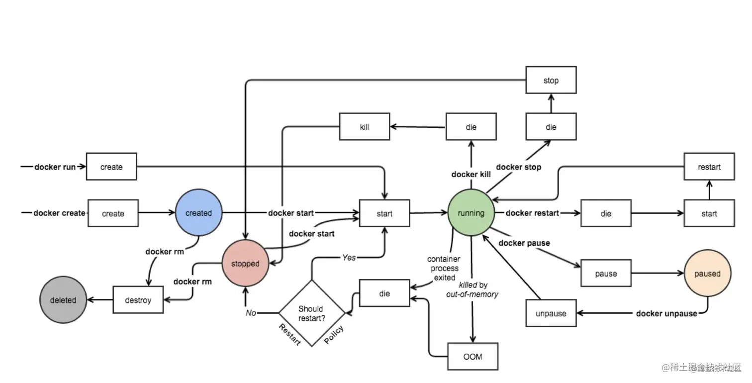在这幅图中,我们可以看到,Docker 容器的生命周期里分为五种状态,其分别代表着: