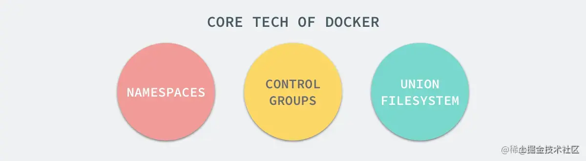 Docker 的实现,主要归结于三大技术:命名空间 ( Namespaces ) 、控制组 ( Control Groups ) 和联合文件系统 ( Union File System ) 。