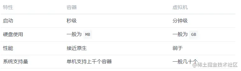 - 资源占用多: 虚拟机会独占一部分内存和硬盘空间。它运行的时候,其他程序就不能使用这些资源了。哪怕虚拟机里面的应用程序,真正使用的内存只有 1MB,虚拟机依然需要几百 MB 的内存才能运行。