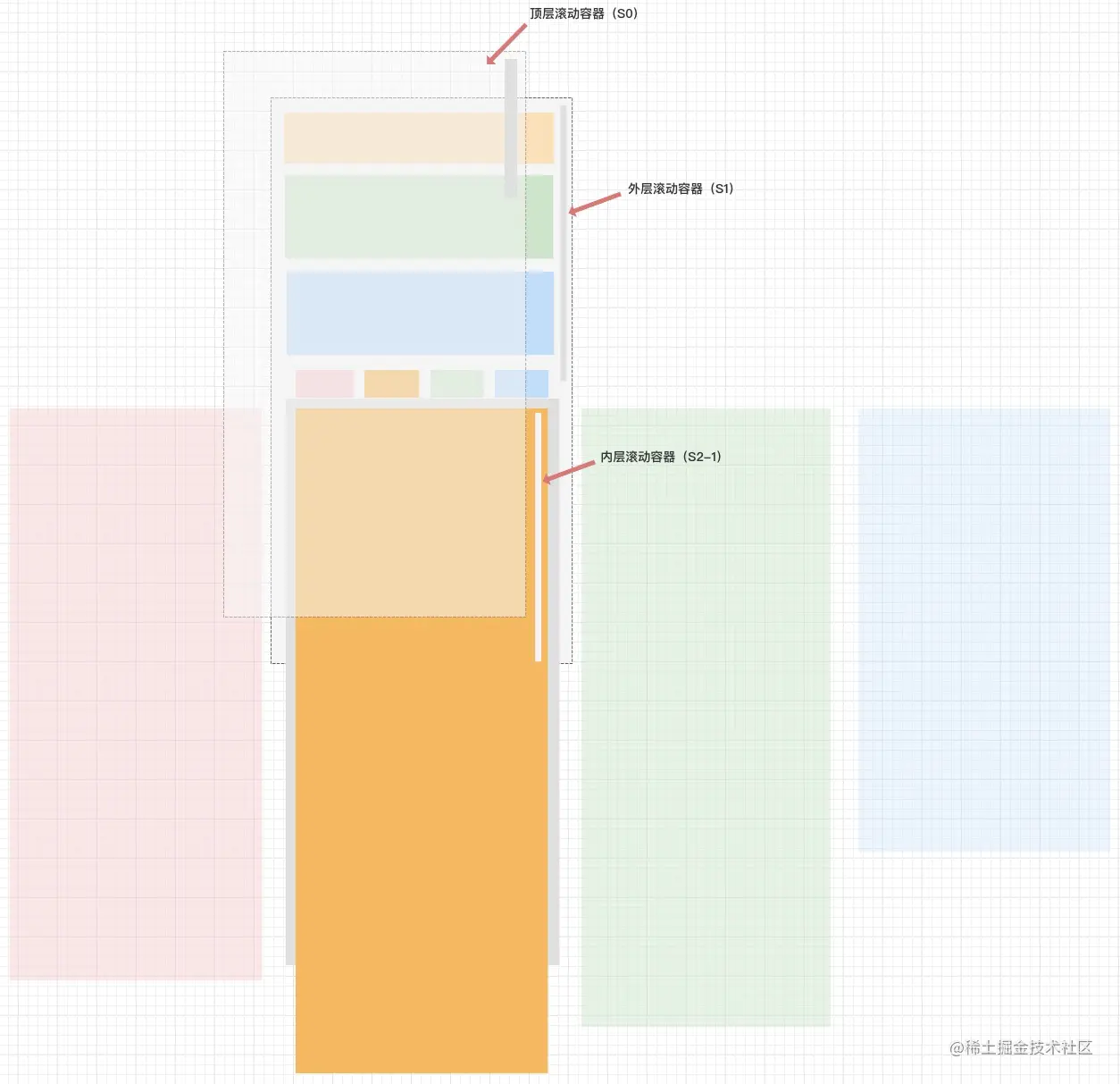 从iOS客户端同学那学习到一种方案是通过最顶层的一个不可见滚动容器(S0)来传递滚动偏移量,而真正内容承载的容器使用的是传统的外滚动容器(S1)嵌套多个子滚动容器(S2-x)方式,大致原理可以参考下图: 大致思路如下: