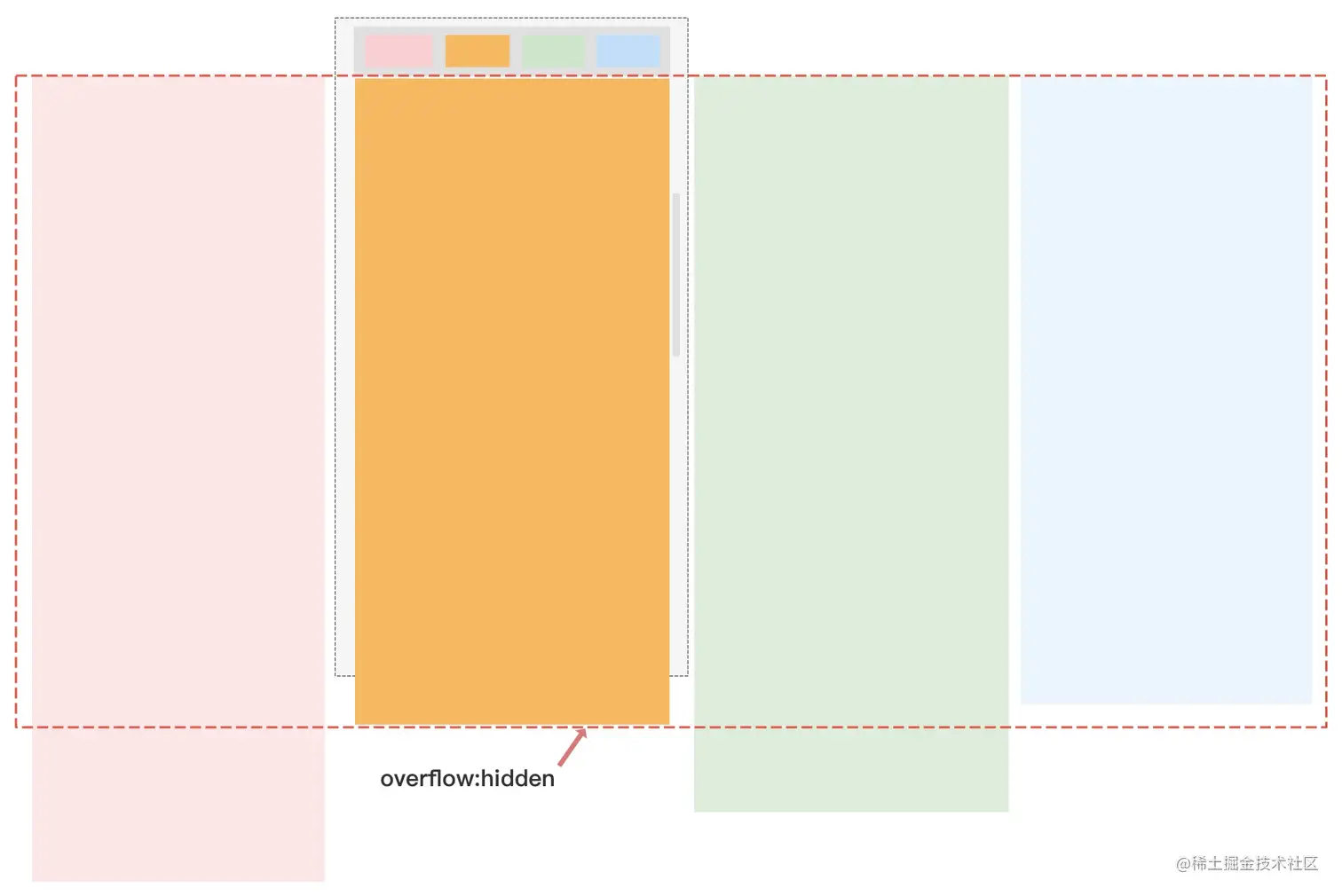 我们之所以要给某些容器设置overflow:hidden主要原因是在不同tab容器内容高度是不一致的,为保证当前tab正确的滚动高度,我们需要借助overflow:hidden来裁剪掉相比当前tab容器长度要长的其余容器,大致如下图:子tab吸顶问题与overflow:hidden之间没有什么好的解法,我们最终选择的是绕开它两同时的时机。 横滑开始时:所有tab容器取消overflow:hidden,这样可以保证横滑过程中看到的是正常吸顶的 横滑结束时:当前可见tab容器不需要设置,其他tab容器设置overflow:hidden