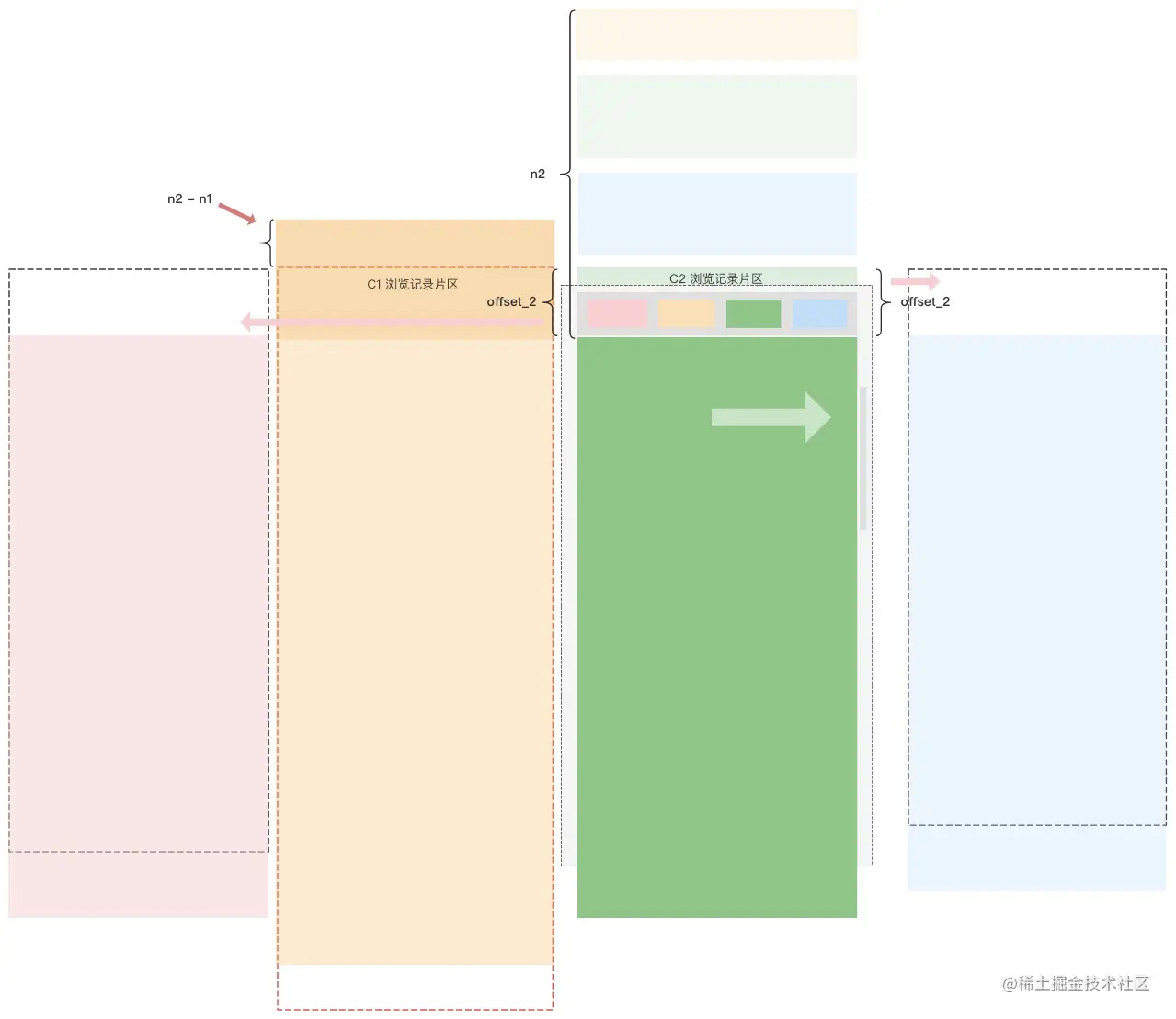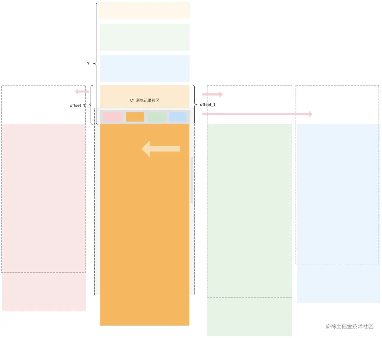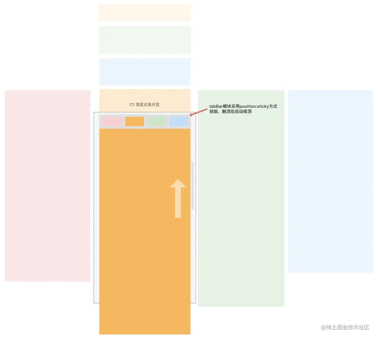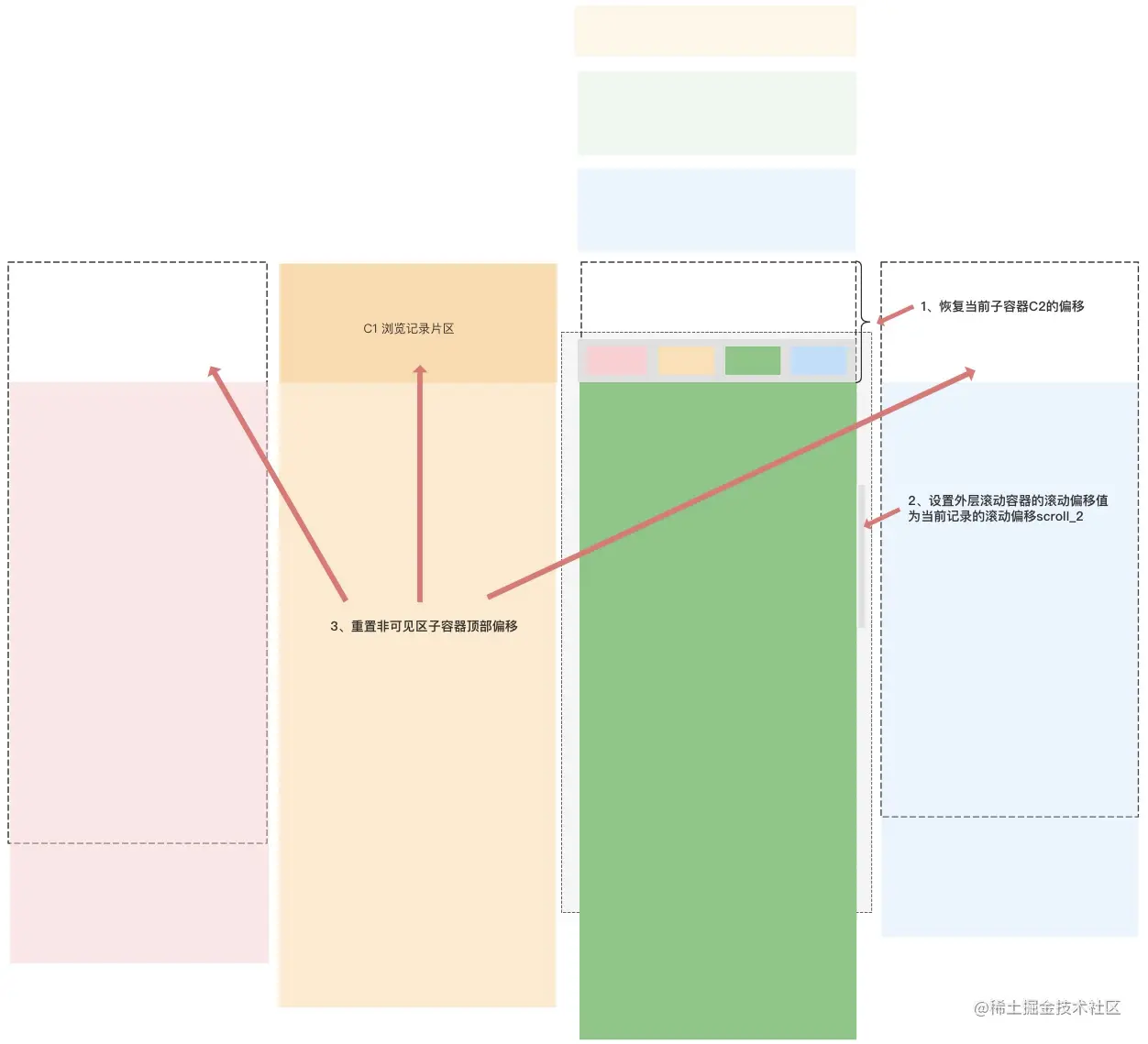 1.根据多tab模块当前的距离顶部偏移量offset_1来设置其余非可见区的子容器(C0/C2/C3)顶部偏移值,以保切换过程的独立浏览位置正确展示2.记录此时外层滚动容器的滚动偏移值n1,并记录为scroll_1 = n1 以上操作会在横滑视觉效果之前完成,保证横滑过程中能正确看到下一子容器的正确浏览位置。
