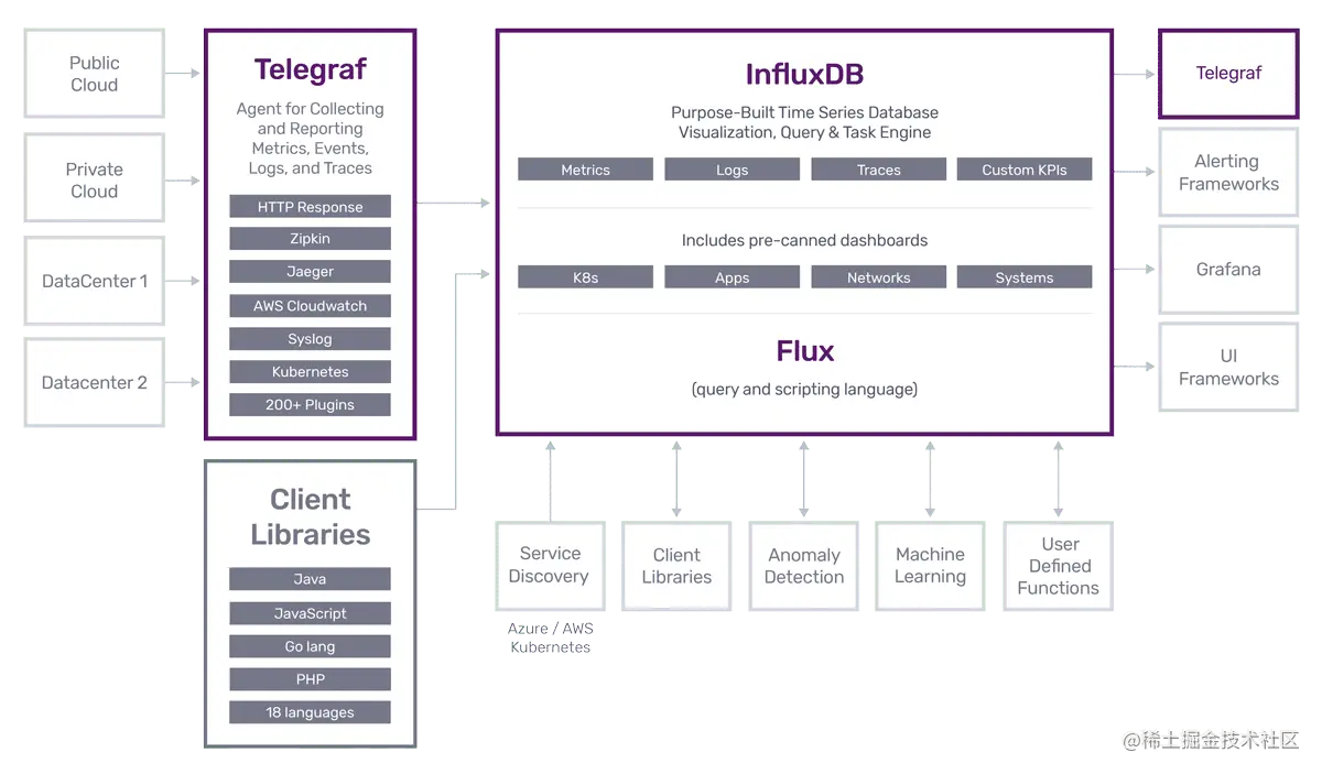 InfluxDB[9]是一个一站式的时序工具箱,包括了时序平台所需的一切:多租户时序数据库、UI和仪表板工具、后台处理和监控数据采集器。如下图9所示。