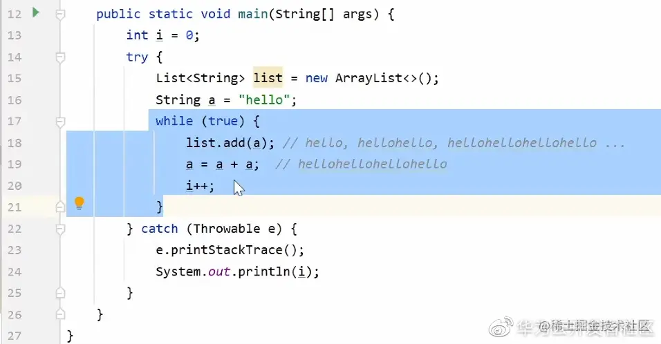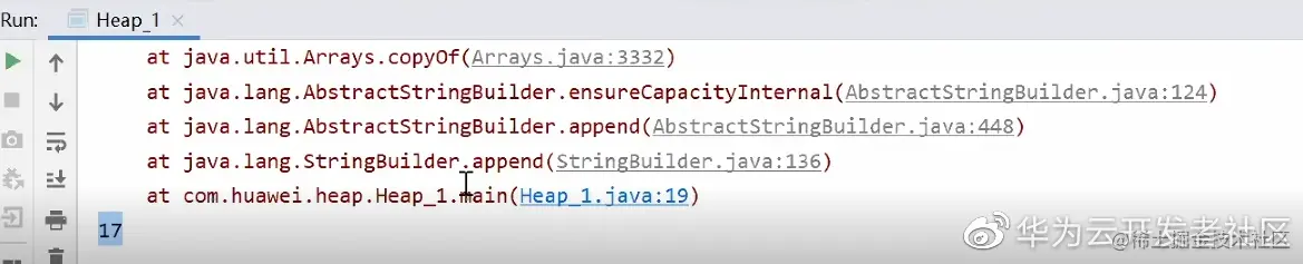 操作基本和栈内存溢出的时候的案例一样,次数明显变小了,只调用了17次就出现了堆内存溢出错误了。