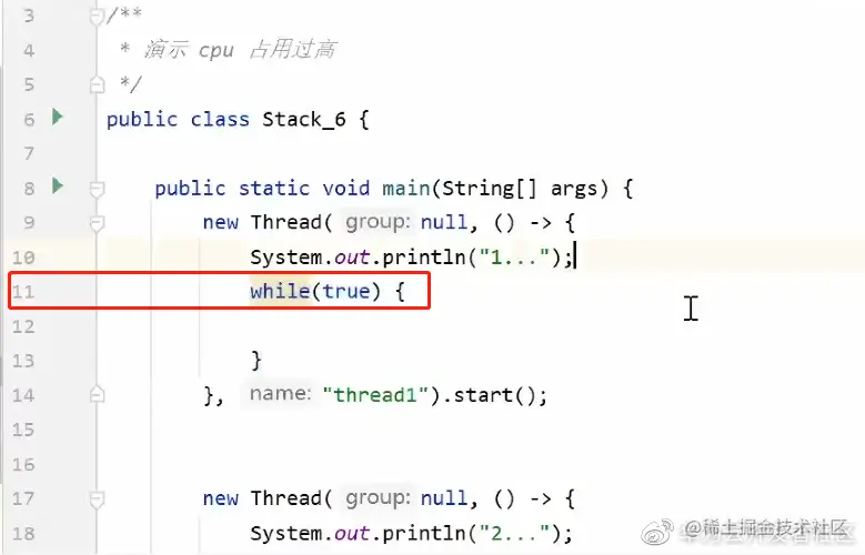 通过对比nid(线程id)4fd9,我们发现这个叫thread1的线程一直在运行(RUNNABLE状态),并且查看到位置是位于Stack_6.java文件的第11行出现的问题。。。