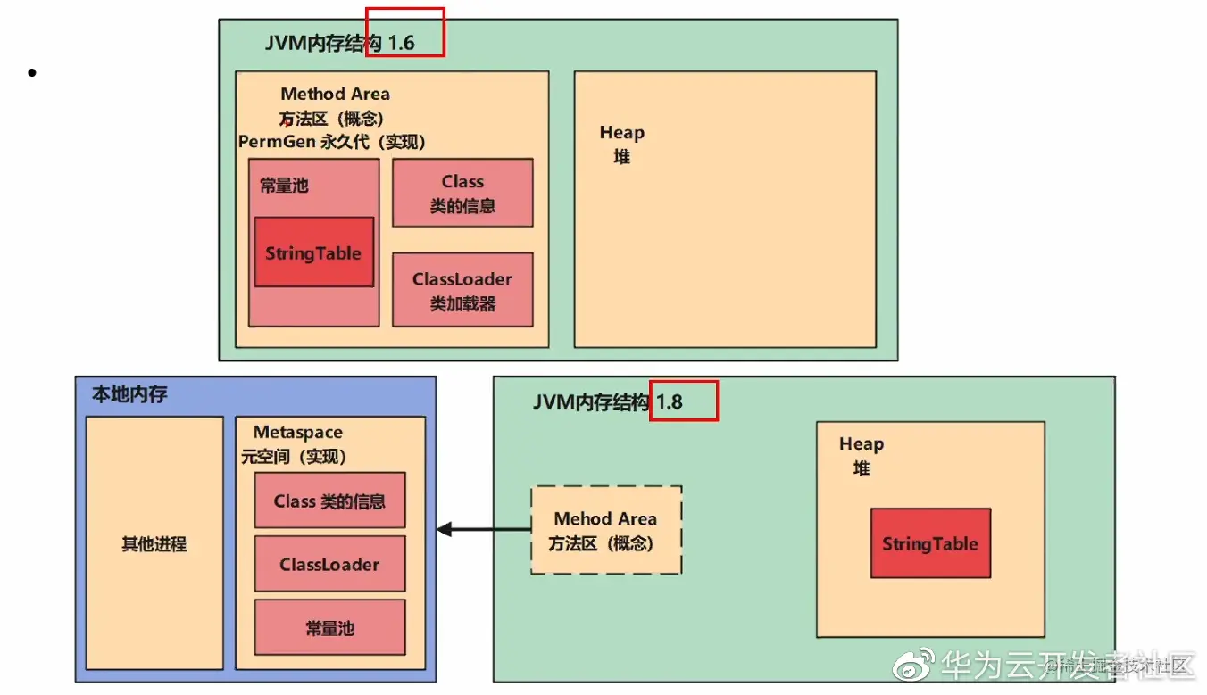 在JVM内存结构1.6的时候,方法区保存在内存结构中,叫做永久代,里面存储了运行时的常量池(包含串池StringTable)、类的信息、类加载器;