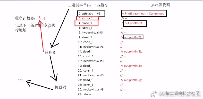 JVM会通过程序计数器记录下一条需要执行的JVM指令的地址(比如第一行的0),然后交给解释器解析为机器码,最后交给cpu(只能识别机器码),完成一行的执行。