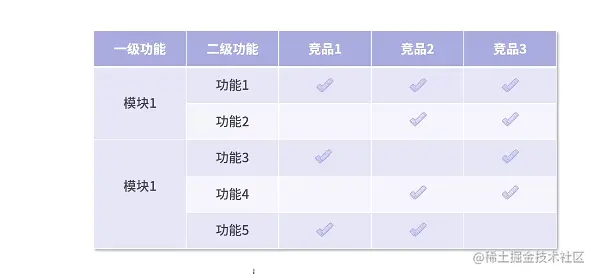 比较法是最常见的,通过罗列每个产品下的功能树图。对比一级功能、二级功能,参考竞品是否存在有。