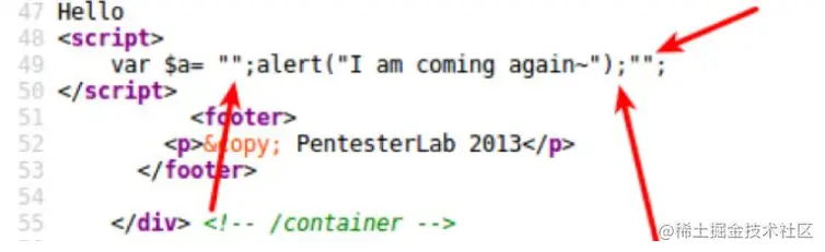 这个时候就要我们手动闭合掉两个双引号来实现攻击,别忘了,javascript是一个弱类型的编程语言,变量的类型往往并没有明确定义。