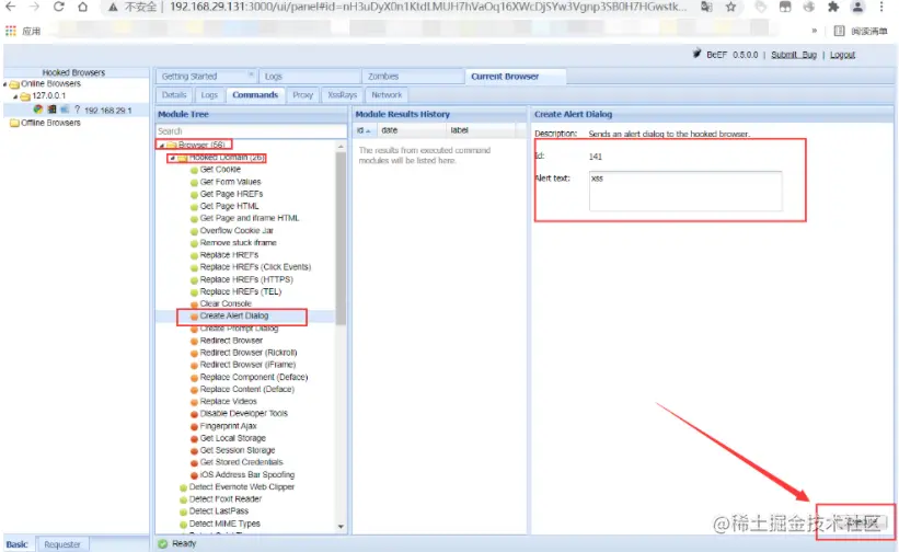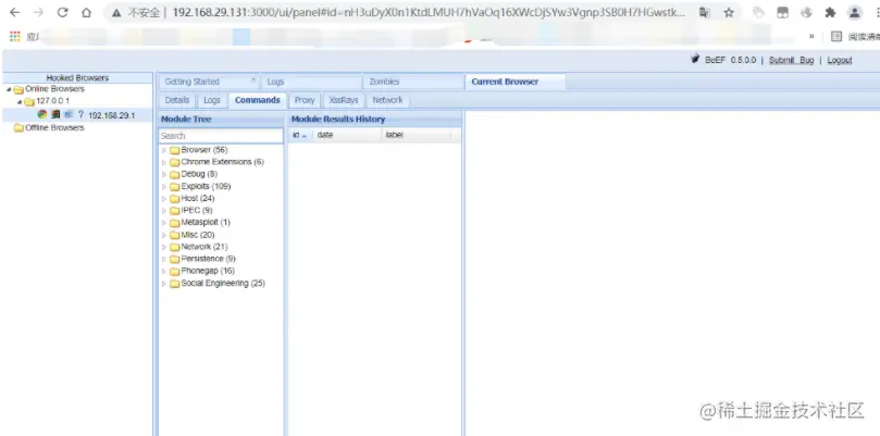 这时候再回到BeEF中查看,会发现online browers中多了点东西