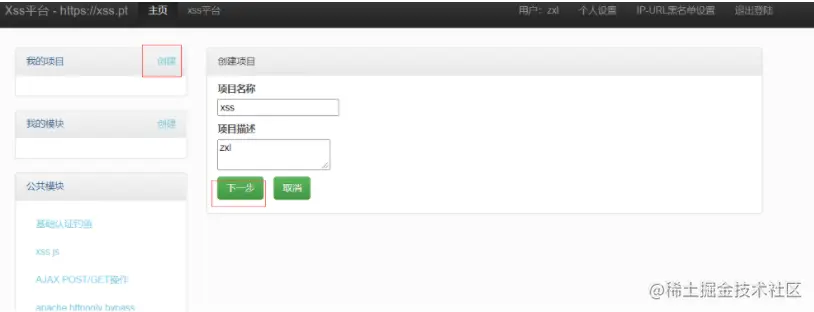 xss.pt/,并创建一个新项目