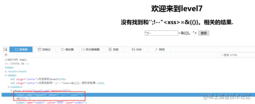 2.在输出框输入’’;!—“=&{()}。查看符号是否会被过滤或转义